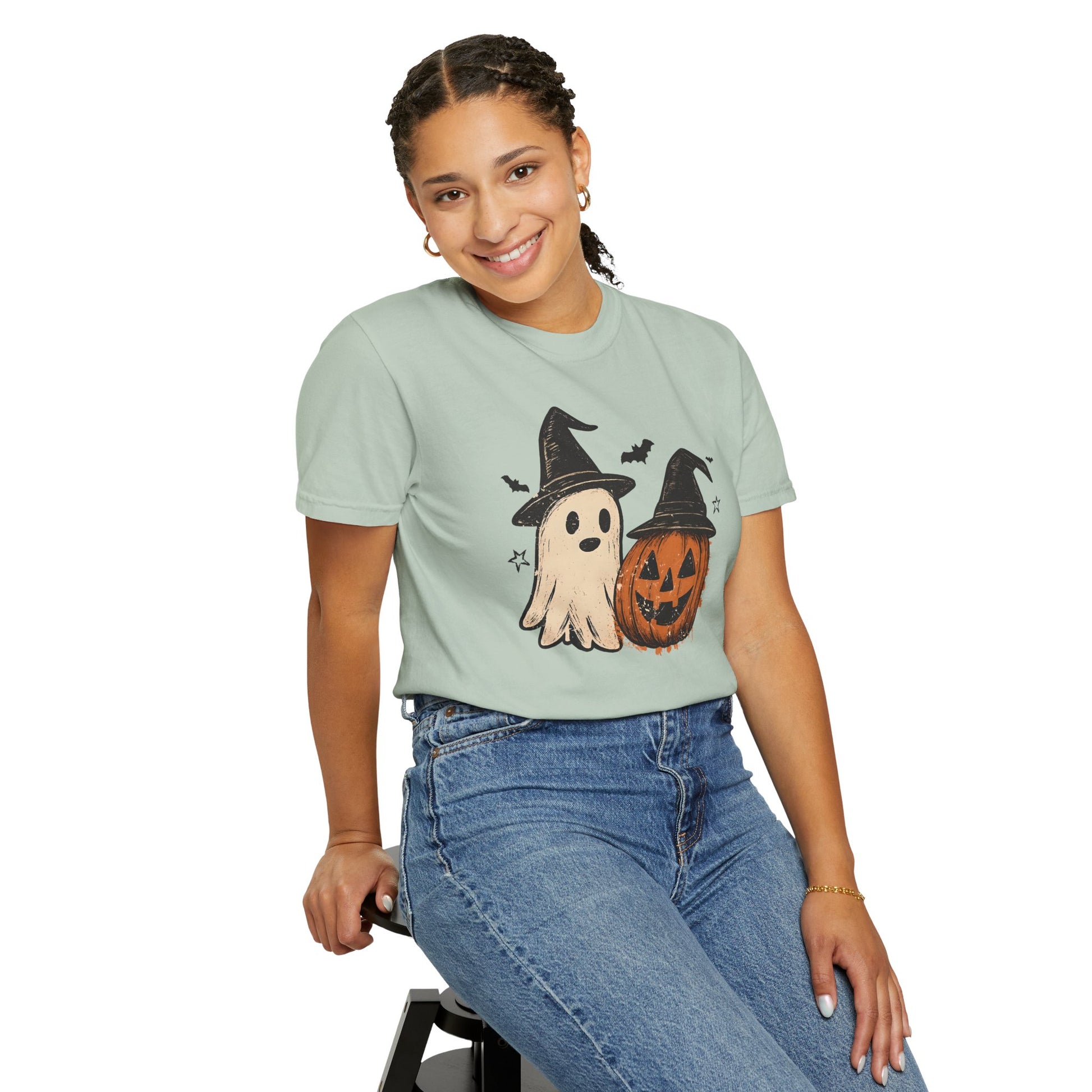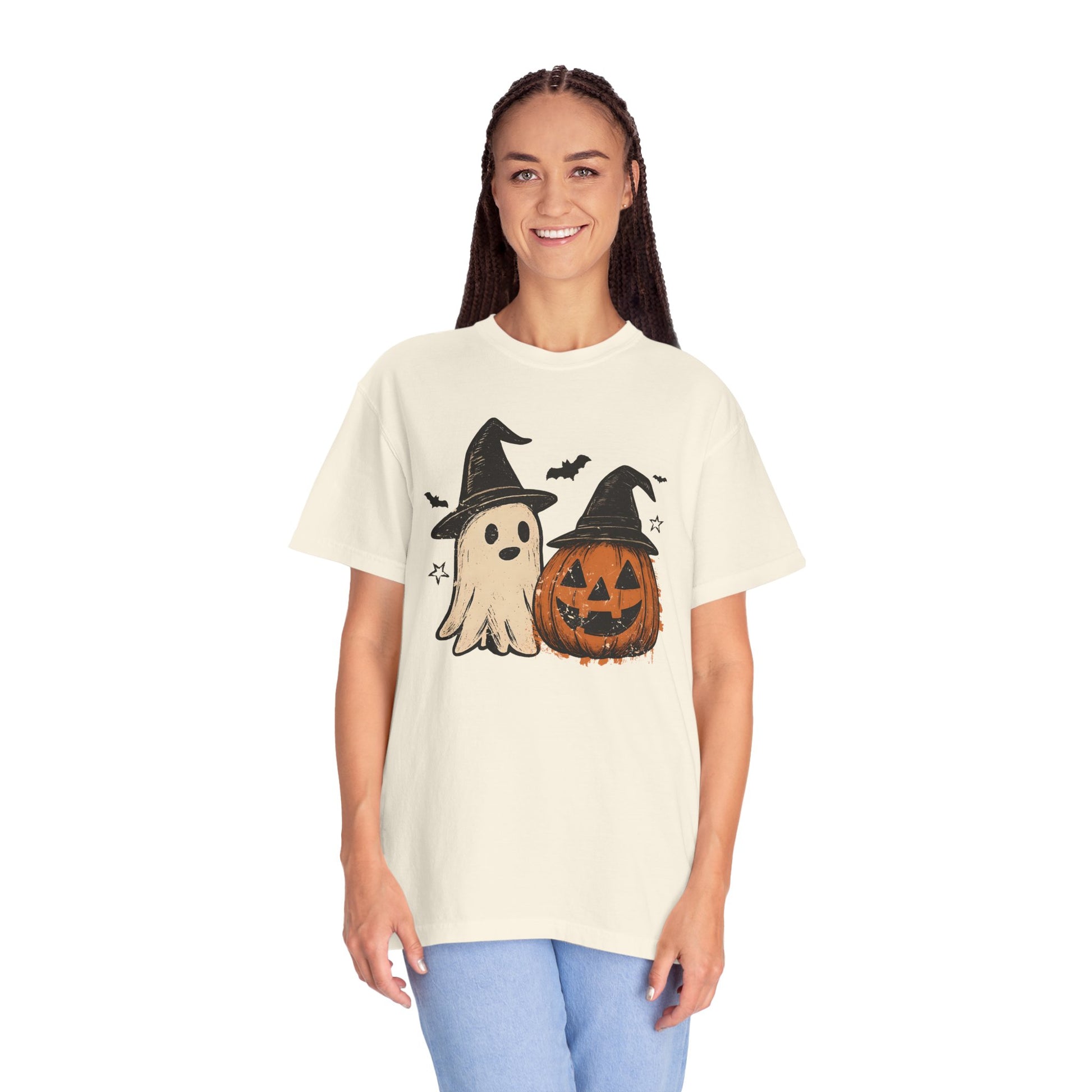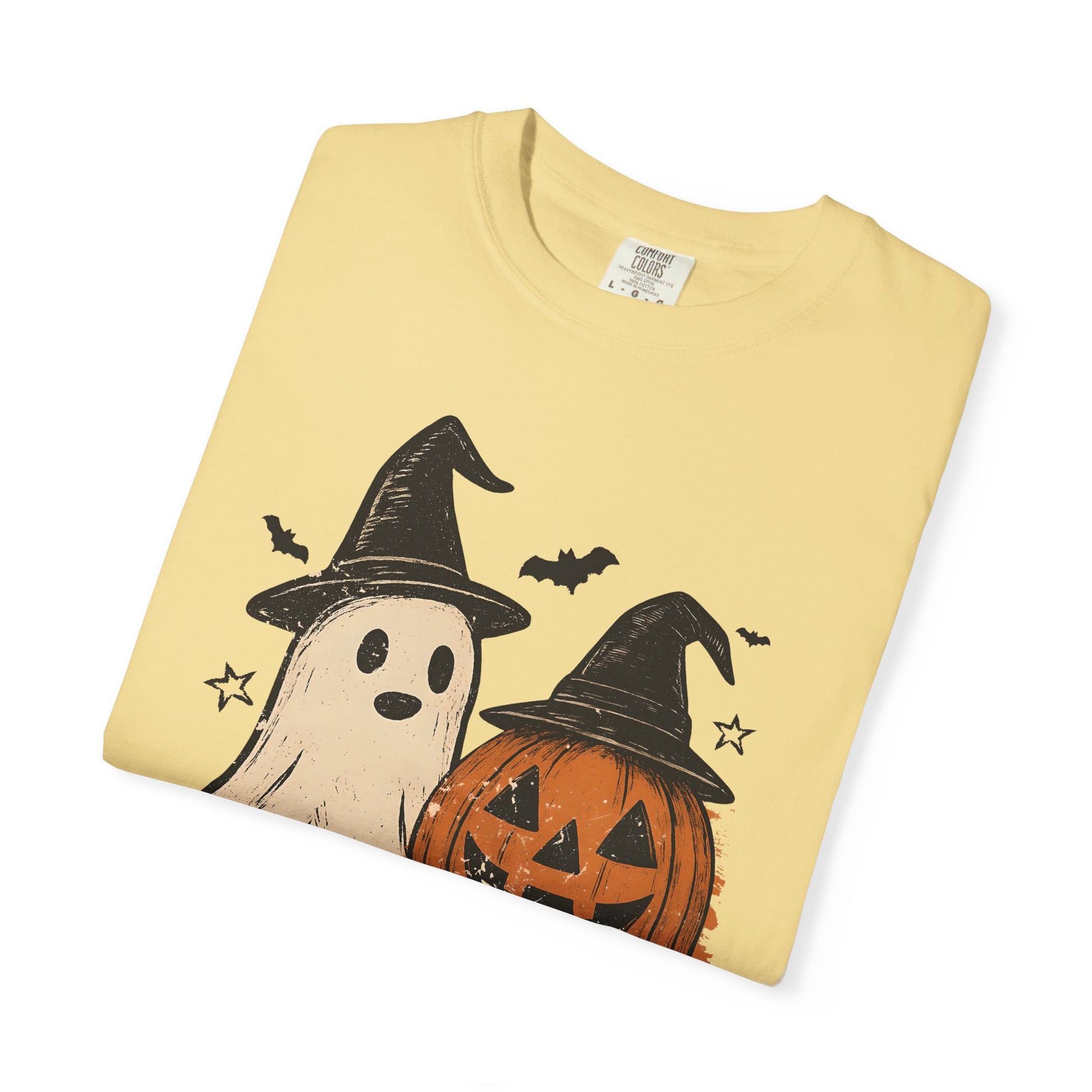 Embrace the spirit of the season with our lovingly crafted unisex Comfort Color garment-dyed T-shirt. This shirt offers a relaxed fit, perfect for cozy days at home or festive gatherings. Celebrate Halloween with its charming design featuring a playful ghost and a classic pumpkin, setting a delightful vibe for your celebrations. Ideal for friends, family, or anyone who enjoys a fun, casual style, this tee can easily be dressed up with accessories or kept simple. It's perfect for Halloween parties, trick-or-treating, or simply enjoying autumn festivities with friends and loved ones. Its vibrant color options allow you to express your personal style for any occasion!