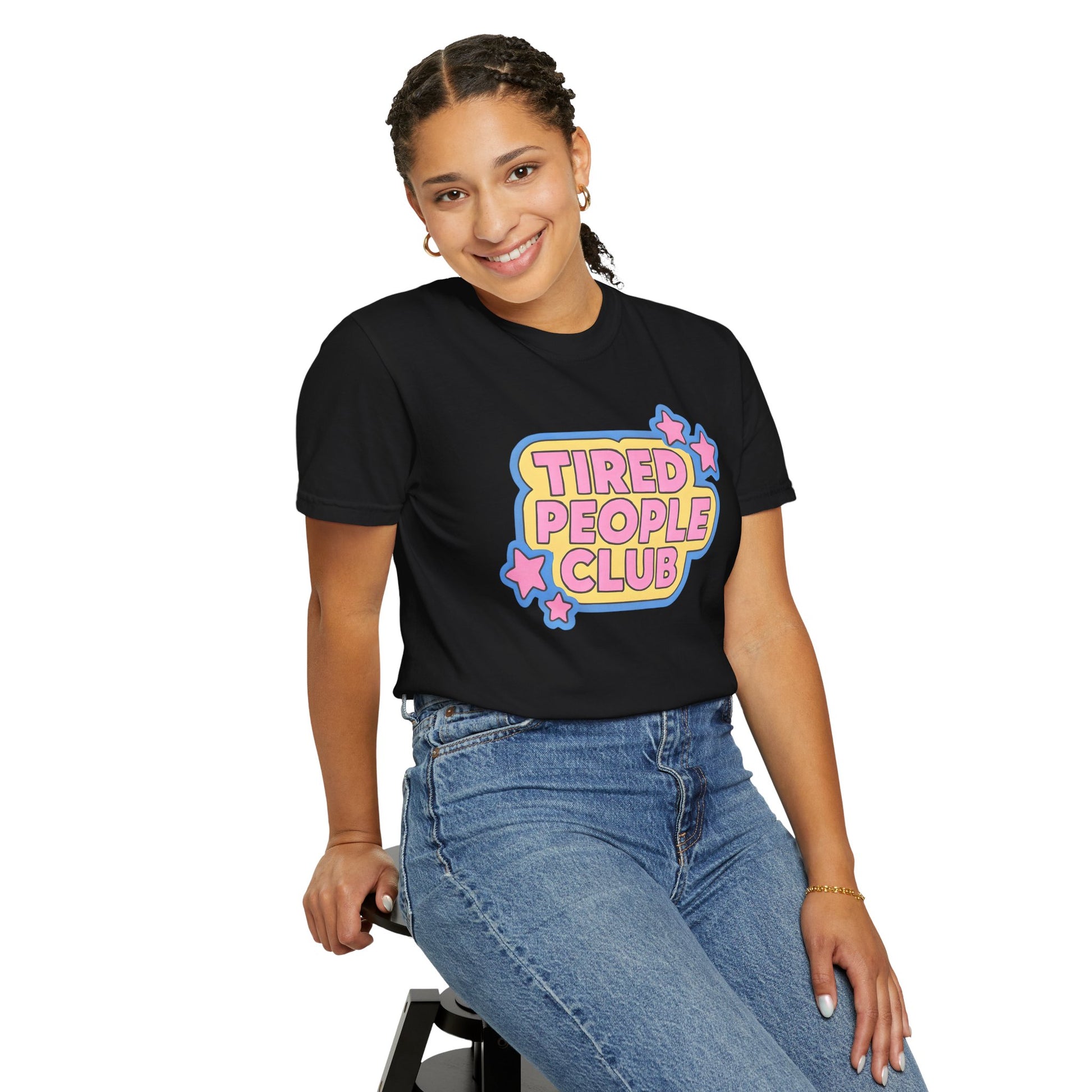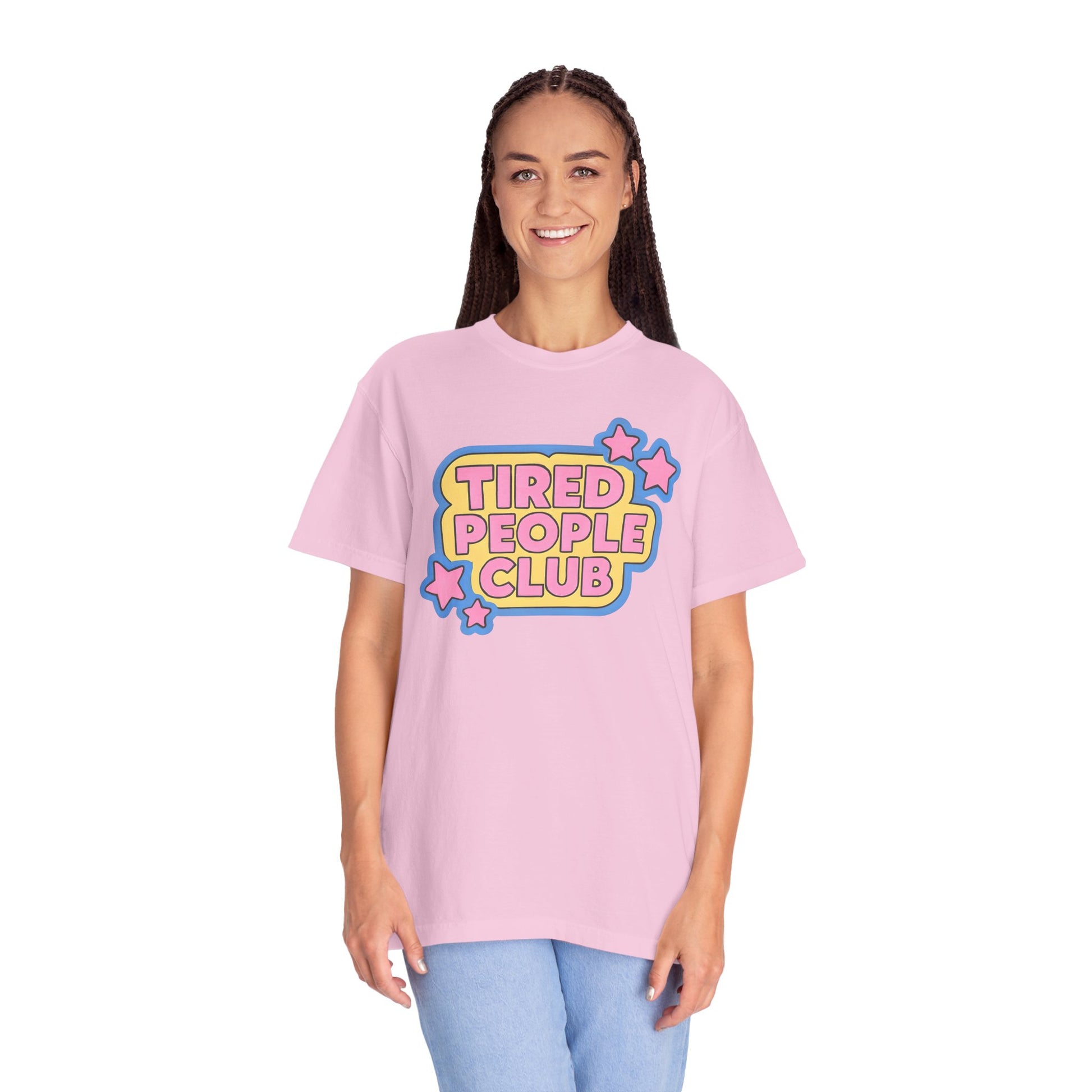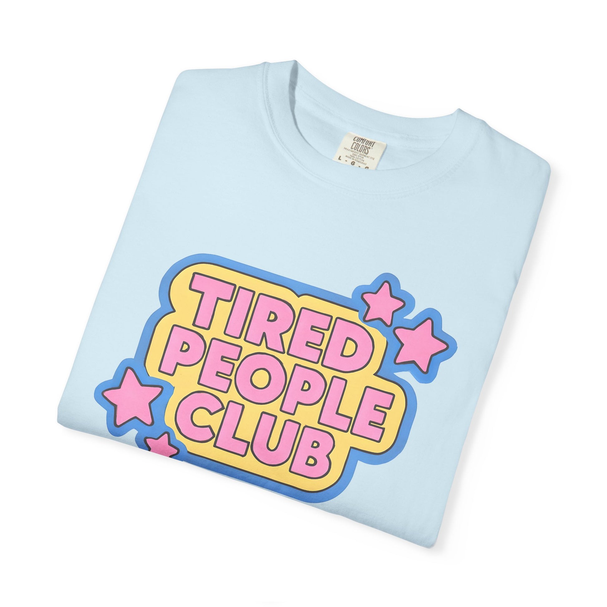 Introducing our cozy Unisex Comfort Color Garment-Dyed T-shirt. The playful 'Tired People Club' design adds a fun vibe, making this tee an ideal choice for casual outings, lounging at home, or attending laid-back gatherings with friends. Its relaxed fit and classic crew neckline ensure you look good while feeling great. This shirt is perfect for adults who appreciate unique, trendy clothing options and is a fantastic gift for birthdays, holidays, or just because!